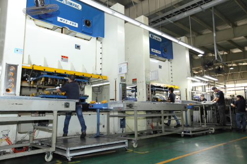 本设备无需对材料加热即可进行加工,短时间内即可加工出精确尺寸、模样,具备可替换性,适合用于大量生产。 按种类分为油压式和机械式。 大荣精密科技中所使用的设备采用机械式压力加工(press),通过齿轮、曲柄等传动器具产生动力进行加工作业。